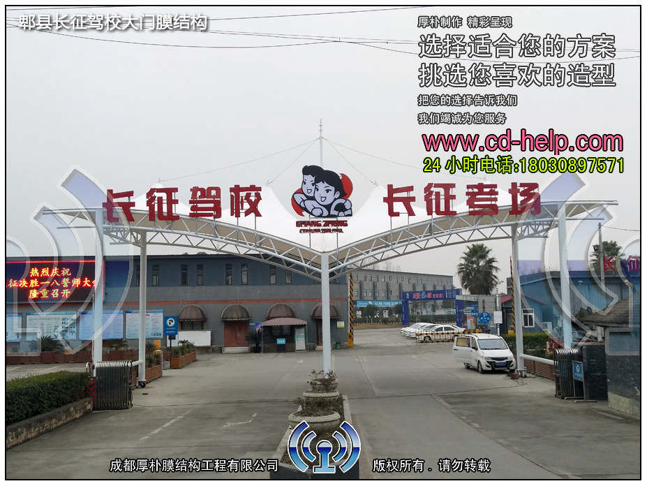-工程名称 郫县长征驾校大门膜结构 -工程地点 郫县团结永定村7组202号 -工程面积 150平方米 -建设单位 郫县长征驾校 -设计单位 成都厚朴膜结构工程有限公司 -施工单位 成都厚朴膜结构工程有限公司 -工程内容 钢结构、膜结构制作安装 -开竣工时间 208年1月20日-2018年2月5日